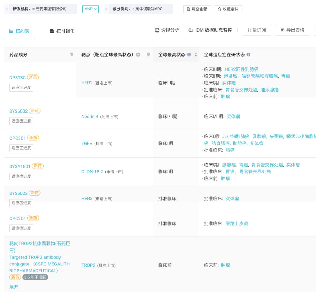 其中,针对 ADC 新药,据 Insight 数据库显示,当前石药有 7 款在研,并有两款成功授权出海。
