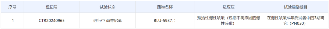 中国药物临床试验登记与信息公示平台官网近日公示,Bellus Health公司已经登记启动了一项国际多中心(含中国)3期临床研究,以评估BLU-5937治疗难治性慢性咳嗽(包括不明原因的慢性咳嗽)的安全性和有效性。