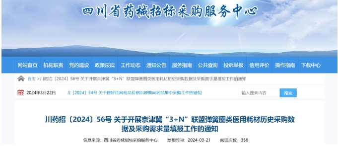 3月21日,四川省药械招标采购服务中心发布《关于开展京津冀“3+N”联盟弹簧圈类医用耗材历史采购数据及采购需求量填报工作的通知》(以下简称《通知》)。