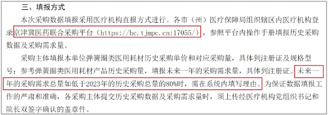 据《通知》显示,采购主体需填报弹簧圈类耗材历史采购单价和对应采购量,以及未来一年的采购需求量。此外,通知强调到,若未来一年的采购需求总量低于2023年历史采购总量80%,需填写理由。历史数据填报时间为2024年3月20日—3月24日12时,需求量填报时间为2024年3月20日—3月25日12时。
