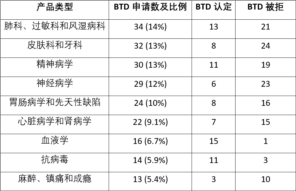 在240项非肿瘤BTD请求中,93项请求(39%)获得批准,147项请求(61%)被拒绝。表1显示了治疗领域的BTD决策总结。