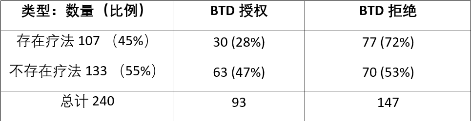 在240项BTD请求中,有107项(45%)在提交BTD时存在相关的疗法,其中30项(28%)获得批准,77项(72%)被拒绝。 在针对尚无批准疗法的240项请求中,有133项 (55%)获得批准,70项(53%)被拒绝。