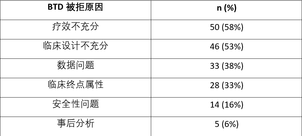 数据相关问题、治疗效果不足、研究设计不充分、终点属性、安全问题和对后分析(post-hoc analyses)是FDA拒绝BTD请求的最常见原因。