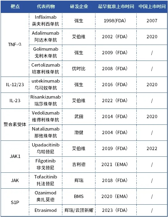 与传统药物治疗相比,生物制剂在诱导和维持IBD临床缓解,促进黏膜愈合方面疗效具有优势,英夫利西单抗和阿达木单抗之后,临床针对IBD生物制剂的研发也逐渐火热,不断有新的TNF⁃α单抗、不同靶点的生物制剂和小分子药物被批准用于CD/UC的治疗,延续至今,已有13种治疗IBD的生物制剂和小分子药物在全球范围内获批上市。