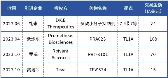2023年全球IBD领域的4笔大额重磅交易中,其中3笔均出自TL1A靶点,足见其受重视程度。
