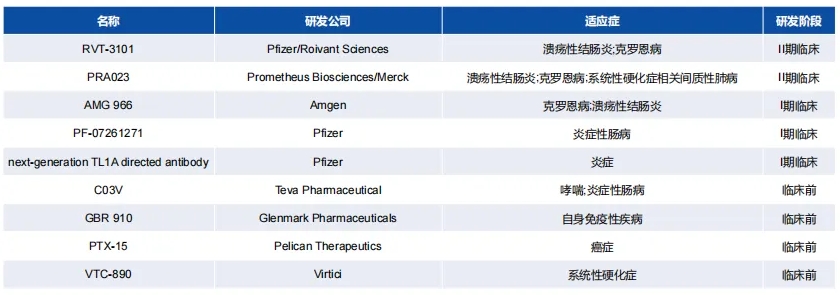 有研究表明,作为TNF超家族成员之一,TL1A抗体可以阻断DR3受体转导下游信号参与免疫调节,能独立地介导炎症和纤维化。不止于IBD市场,TL1A抗体的特性还可以拥有更大的延展空间,可以用于治疗包括IBD在内,类风湿关节炎、系统红斑狼疮或器官性纤维化等疾病,这正是TL1A备受MNC青睐的原因。
