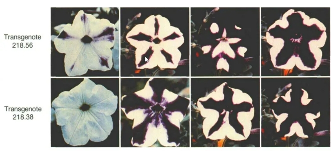 科学发现常常发生在不经意的日常生活中,万有引力如此,RNAi现象也是如此。1990年的一天,研究转基因植物的科学家Carolyn Napoli和Van der Krol往紫色喇叭花中导入了一份查耳酮合成酶的基因片段。这种合成酶是一种在植物中发现的可以控制花朵色素合成的蛋白,其表达量的改变能够影响花朵的颜色及其深浅程度。两位科学家原本预期在导入基因片段后,收获一朵颜色更深、更加鲜艳的喇叭花,结果却得到了一朵白色喇叭花[5,6]。研究者们后来发现,转基因花中查尔酮合成酶的浓度远远低于正常的喇叭花,于是推测是外源转入的基因以某种方式抑制了植物中内源基因的表达。
