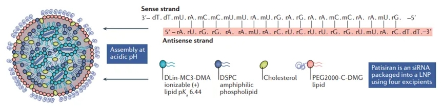 但任何一个重大技术或重磅疗法的开发总是需要有人推动。重整旗鼓后,Alnylam还是决定继续攻克递送系统的难关。研究人员意识到,需要更加有效的离子化脂质体来改善LNP的效力和安全性。这一次,他们终于找到了突破口——MC3脂质体浮出了水面。与此前的脂质体相比,MC3-LNP的沉默效力提高了100倍,并且治疗指数得以扩大[14]。Alnylam最终推出了针对转甲状腺素(TTR)-介导的淀粉样变性(ATTR)的RNAi药物Onpattro(Patisiran),这款产品也成为了首个进入市场的RNAi治疗药物。