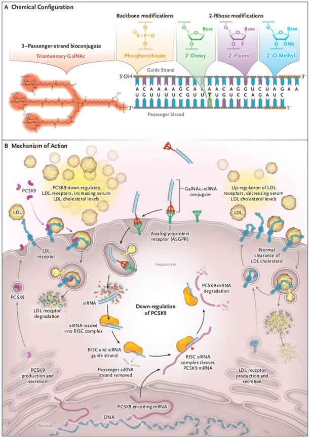 英克司兰是Alnylam在常见病领域探索siRNA治疗潜力的一次尝试。2013年初,Alnylam决定为PCSK9项目寻求合作伙伴。前蛋白转化酶枯草溶菌素9(PCSK9)是“坏胆固醇”LDL-C升高的“帮凶”。PCSK9会与肝细胞表面清除LDL-C的受体结合,阻挠“坏胆固醇”的吸收。由于PCSK9主要在肝脏中表达,而Alnylam刚好拥有肝靶向递送技术——GalNAc是肝细胞的去唾液酸糖蛋白受体(ASGPR)的配体,因此其研发团队便着手设计能够抑制PCSK9表达的siRNA药物,英克司兰于是应运而生。