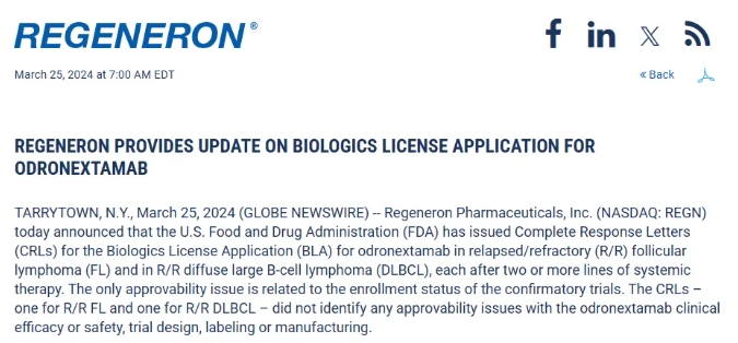 3月25日,再生元Regeneron宣布,FDA拒绝其CD3/CD20双抗Odronextamab治疗复发性或转移性滤泡淋巴瘤(FL)和弥漫大B细胞淋巴瘤的上市申请,再生元表示唯一原因是确证临床的入组状态问题,FDA在完整的回复函(CRL)中没有发现任何与有效性、安全性、试验设计、标签或制造有关的问题。