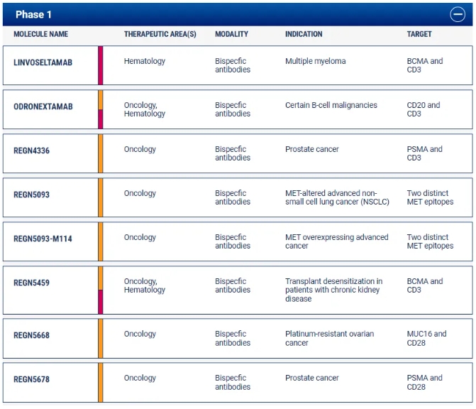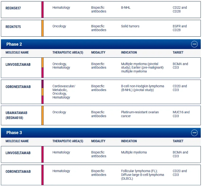 这款CD3/CD20双抗已在复发/难治性滤泡性淋巴瘤以及复发/难治弥漫大B细胞淋巴瘤( DLBCL )中获得批准,均经过2线或2线以上的系统治疗。在12月的ASH上,Regeneron报告了DLBCL的2期数据,显示52 %的反应率。作为最大的淋巴瘤临床项目之一OLYMPIA项目的一部分,Regeneron一直在积极招募odronexamab的多个3期试验患者。