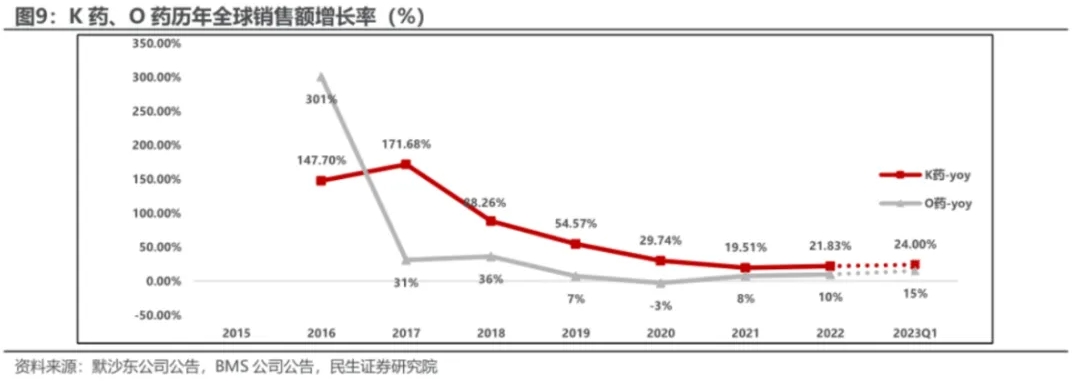 2019-2022年,K药全球销售额增长率分别为54.57%、29.72%、19.51%、21.83%。无独有偶,O药自2018年全球销售额增长率达到36%后,2019-2022年分别为7%、-3%、8%、10%。