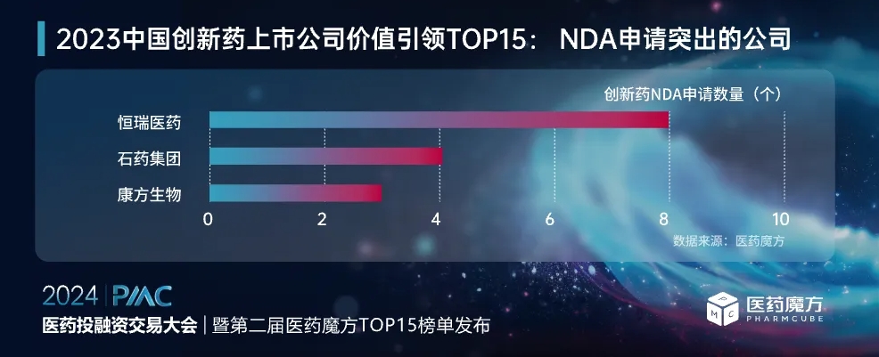 而在创新药NDA申请方面,过去一年,恒瑞医药拿下8个NDA申请,石药集团手握4个NDA申请,康方生物也有3个NDA申请的卓越成绩,代表Biopharma亮出实力。