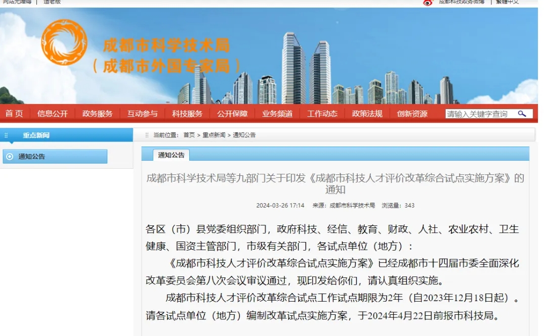 3月26日,成都市科技局等9部门联合印发了《成都市科技人才评价改革综合试点实施方案》,这是全国首个省会城市出台的科技人才评价改革综合试点实施方案,成都科创速度再次领跑全国!