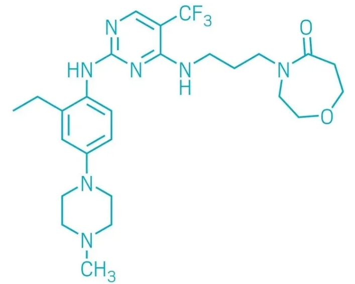DCC-3116是Deciphera公司开发的一款选择性的小分子ULK1/2激酶抑制剂,旨在通过抑制负责启动自噬的ULK1/2激酶来抑制癌症自噬,从而影响肿瘤细胞的存活。它拥有一个中央嘧啶基团,并携带两个仲胺基团形成的双臂结构,这使得它能与目标蛋白结合并将其锁定在非活性构象中。