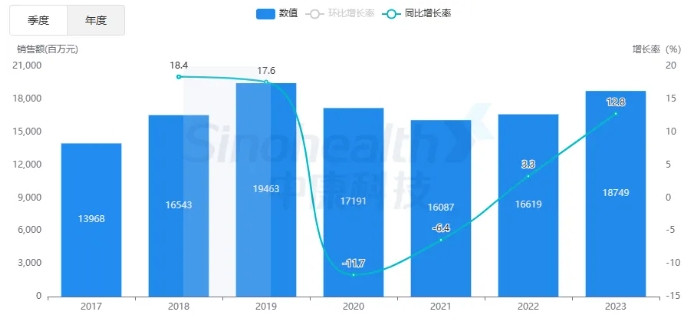 据中康开思系统显示,2023年口服降糖药国内等级医院和零售市场销售总额超308亿元。其中,在国内等级医院销售额达187亿元,同比增长12.8%。
