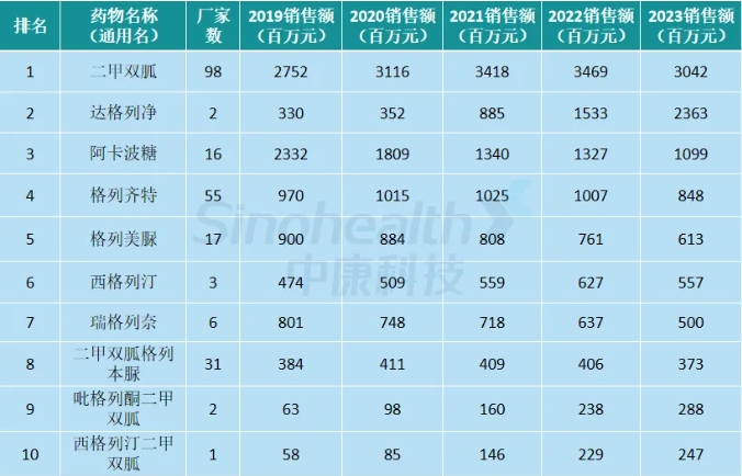 2023年全国等级医院口服降糖药销售额TOP10