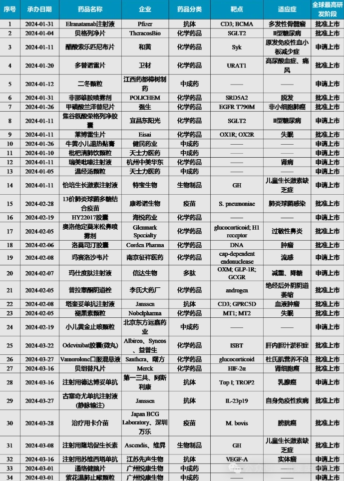 2024年第一季度,根据国家药品监督管理局药品审评中心(CDE)公示,共34个创新药首次提交上市申请(NDA/BLA),其中涵盖化学药物17种,抗体药物5种,疫苗2种,多肽药物1种,生长激素类生物制品2种,中成药7种。这些潜力药物有望于未来一段时间在国内获批并影响整个市场格局。