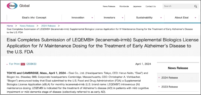 4 月 1 日,卫材宣布,已向 FDA 递交仑卡奈单抗(Lecanemab/Leqembi)静脉注射(IV)剂型的补充生物制品许可申请(sBLA),用于维持治疗存在轻度认知障碍或处于轻度痴呆阶段(统称为早期 AD)的阿尔茨海默病患者。