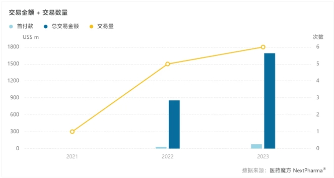 据医药魔方统计,中国创新药产业在2023年达成了103笔BD出海交易(交易对象为创新药、微创新、生物类似药和技术),首付款总计35.26亿美元,总交易金额达420.68亿美元。