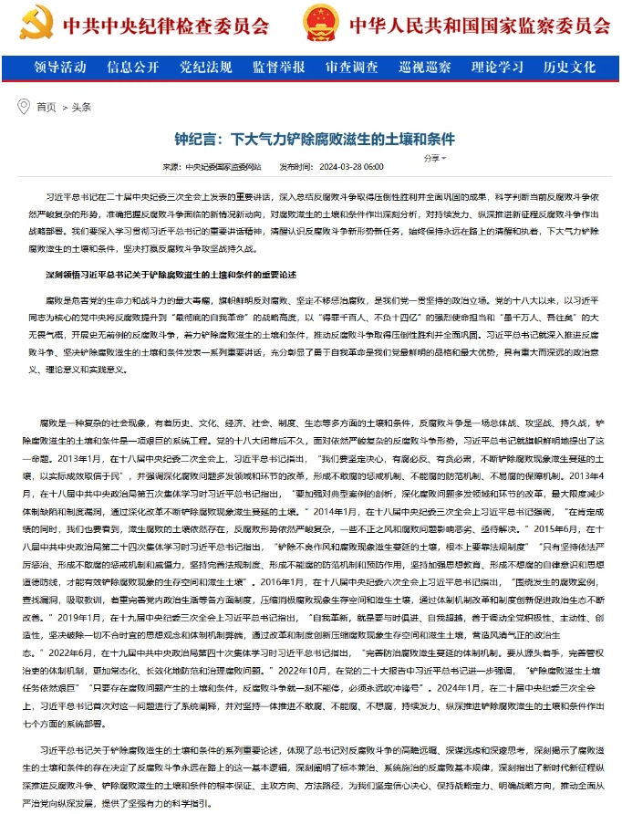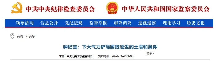 3月28日,中央纪委国家监委网站发布《钟纪言:下大气力铲除腐败滋生的土壤和条件》提到,坚持个案查处与系统整治相结合,深化整治金融、国企、能源、烟草、医药、基建工程和招投标等权力集中、资金密集、资源富集领域的腐败,清理风险隐患。