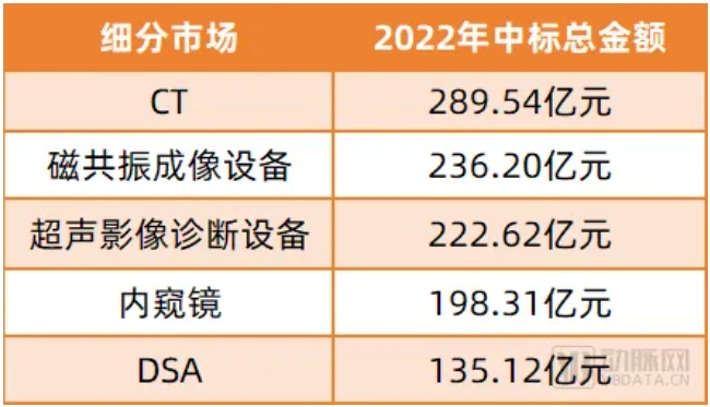 根据医械数据云统计的数据,2022年,X射线机中标总金额约为536.78亿元,其中CT设备约289.54亿元,DSA设备约135.12亿元。此外,2022年,磁共振成像设备中标总金额约为236.20亿元,超声影像诊断设备中标总金额为222.62亿元,内窥镜相关产品中标198.31亿元。