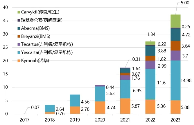 美国、日本、欧盟和中国上市的主要CGT产品销售情况(亿美元)