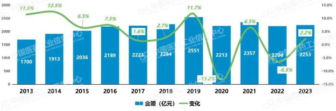 图1:2013-2023年样本医院用药市场总销售额及趋势 来源:PDB药物综合数据库,中国医药工业信息中心