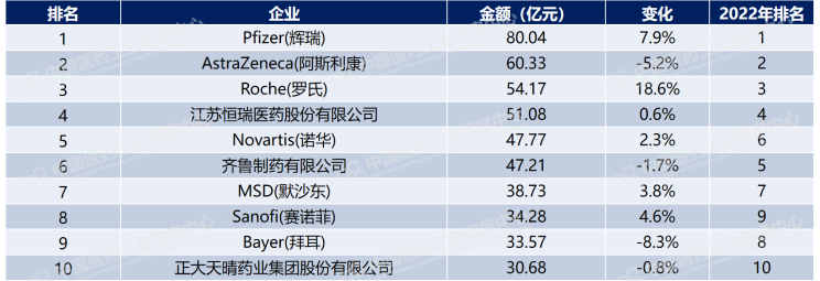 通过统计2023年销售额TOP 10的企业发现,与2022年相比,未有新企业进入,仅5-9名发生排名的变化。前三名企业排名未变,均为外资企业。Pfizer(辉瑞)以80.04亿元的销售额稳居榜首。Bayer(拜耳)是TOP10中降幅最大的企业。国内创新龙头企业江苏恒瑞医药股份有限公司领衔本土药企,另外上榜的两家本土药企分别为齐鲁制药有限公司和正大天晴药业集团股份有限公司。