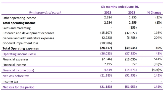 截至2024年3月11日,Abivax只公布了公司截至2023年6月30日的半年财报,截至2023年6月30日的六个月期间,总营业收入为230万欧元,而上年同期为230万欧元,在此期间没有显著变化。总运营费用为3950万欧元,而上年同期为2830万欧元,增加了1120万欧元,增幅为40%。这一增长主要是由于研发费用增加了1750万欧元,一般和行政费用增加了450万欧元,部分被截至2023年6月30日没有商誉减值损失所抵消(截至2022年6月30日为1100万欧元)。