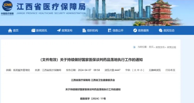 通知要求,定点医疗机构要认真贯彻落实国家、江西省谈判药品管理的各项政策规定,不得以医保总额控制、药占比、次均费用、DRG/DIP支付方式改革、用药目录品种限制、药事委员会评审、已纳入单行支付管理等为由影响谈判药品的进院落地、配备使用。