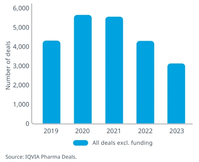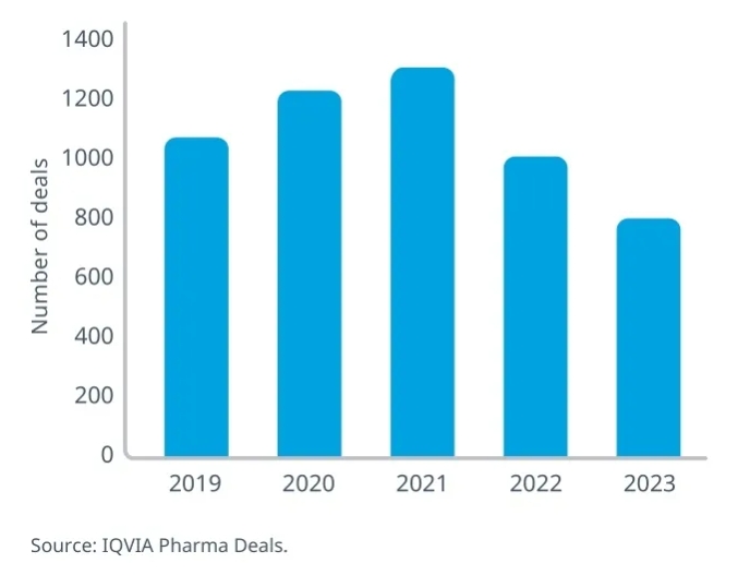与2022年一样,2023年生命科学领域的交易活动依然低迷,原因是持续的宏观经济挑战、飙升的通胀和监管审查使规避风险的公司不敢进行某些交易。根据IQVIA Pharma Deals数据库公开披露的交易活动(图1),如果不包括独立研究补助,生命科学领域签署的协议总数在2022年至2023年期间下降了27%。