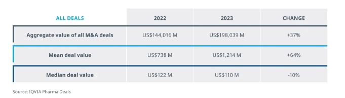 与2022年相比,2023年签署的所有并购交易的总金额(包括或有对价在内)为1.980亿美元,增长了37%。与此同时,并购交易的平均交易额从2022年的7.38亿美元增至2023年的12亿美元,增长了64%。(表1)