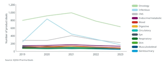 图6:2019-2023年按治疗领域划分的产品交易数量