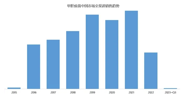据PDB数据查询,全国甲肝疫苗销售在2021年达到高峰,达80余亿元规模,然而在2022年断崖式下跌,截至2023年前三个季度,已跌至历史低点。