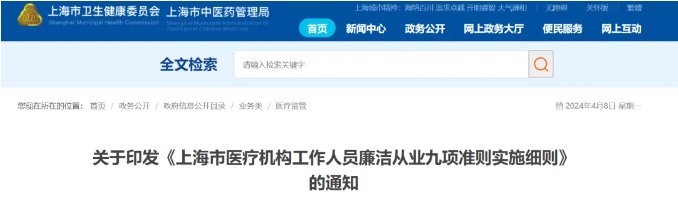 4月7日,上海卫健委发布《上海市医疗机构工作人员廉洁从业九项准则实施细则》。全文一共提到54处“严禁”,对医疗机构相关人员的执业行为进行详细要求。