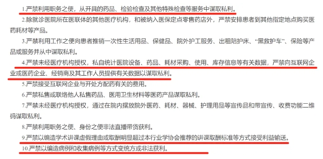 严禁利用职务之便,从开具的药品、检验检查及其他特殊检查等服务中谋取私利;严禁以编造学术讲课虚假理由或取酬明显超过本行业学协会推荐的讲课取酬标准等方式接受利益输送;严禁以编造病例和收集病例等方式变统方或非法获利等。