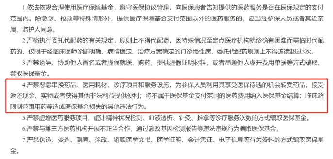 严禁恶意串换药品、医用耗材、诊疗项目和服务设施,为参保人员利用其享受医保待遇的机会转卖药品,接受返还现金、实物或者获得其他非法利益提供便利;将不属于医保基金支付范围的医药费用纳入医保基金结算;临床超限制范围用药等造成医保基金损失的其他违法行为。