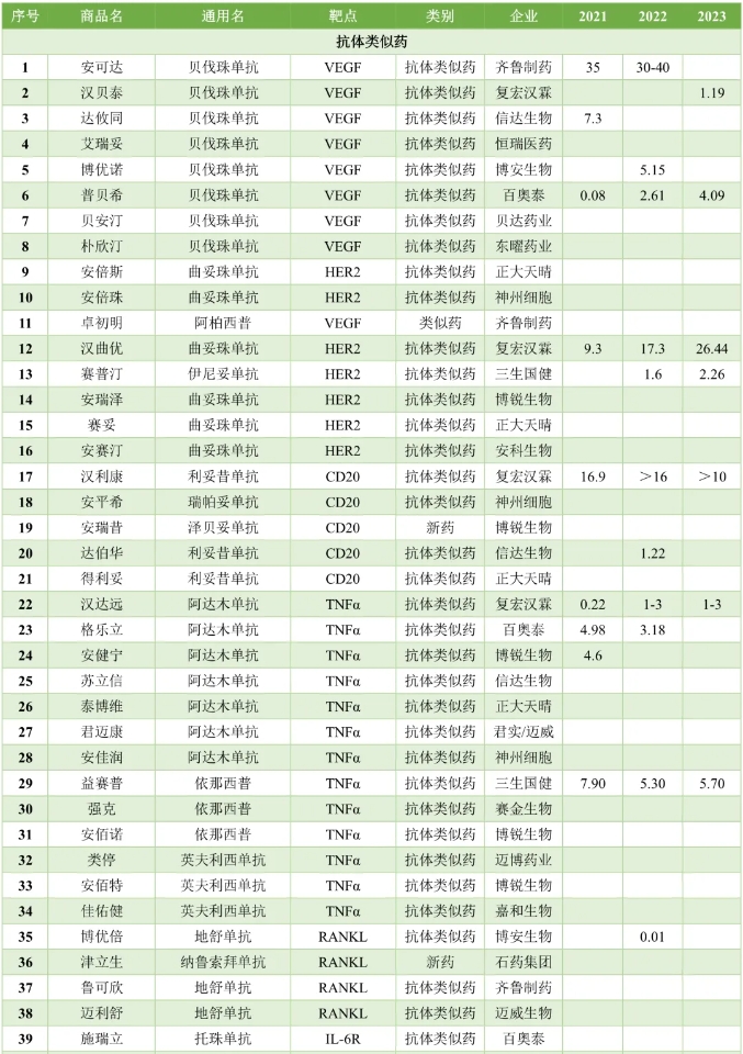 大分子领域,2015年之前几乎没有国产抗体药物,因此这一波伴随着抗体新药和类似药的同步爆发。类似药领域,爆款仍然以肿瘤为主,贝伐珠单抗、曲妥珠单抗、利妥昔单抗达到数十亿元乃至百亿元规模,自免的TNFα则明显小了一个数量级。齐鲁制药、复宏汉霖的抗体类似药均达到数十亿元规模,信达生物也超过10亿元(具体数据未公开)。