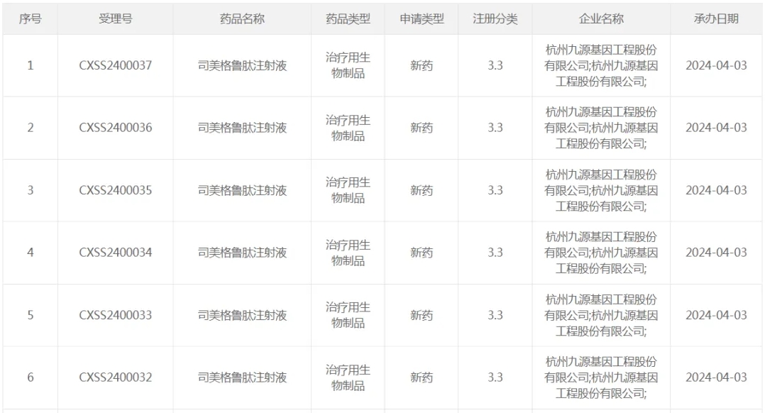 4月3日,国家药监局(NMPA)药品审评中心官网显示,九源基因的司美格鲁肽注射液生物类似药(商品名:吉优泰)上市申请获得受理,适应症为用于成人2型糖尿病患者的血糖控制。这也成为首款申报上市的国产司美格鲁肽。