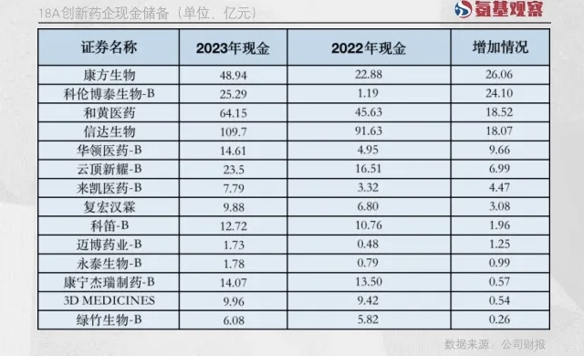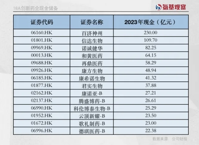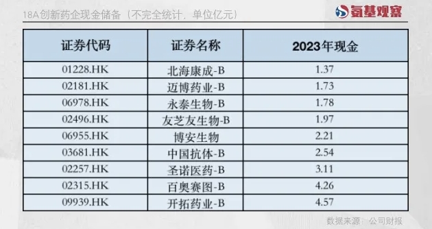 目前,上市的创新药企的现金储备状况如何呢?我们可以从港股18A创新药企的数据中得到一些启示。