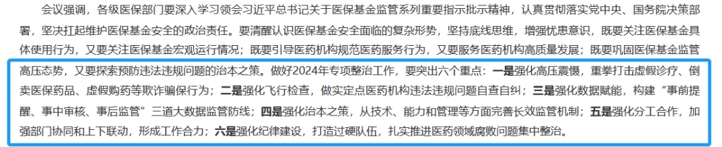 进入2024年,从医保基金监管在医保局系列工作会议中被高频点名的信号来看,2024年无疑将是医保基金监管的大年。
