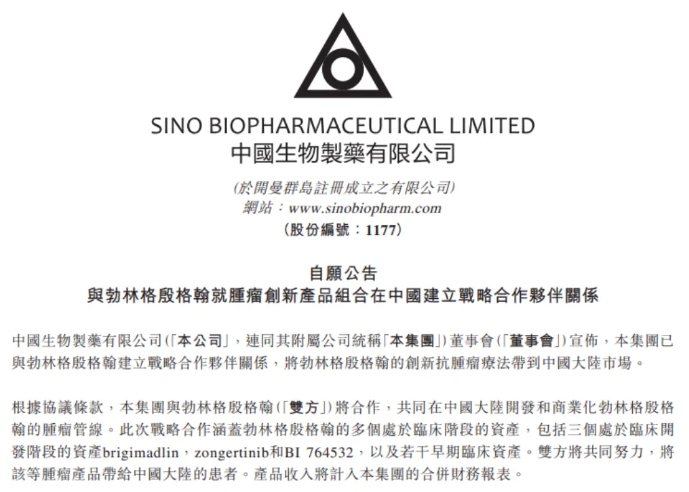 4月8日,中生制药与勃林格殷格翰(BI)宣布签署战略合作协议,双方将依托各自优势和资源,共同在中国内地研发和商业化勃林格殷格翰的肿瘤药物管线。这对已在中国实现了全业务布局,涵盖从研发、生产、销售到服务的完整价值链的勃林格殷格翰来说,确实是一次较为不寻常的战略决定。