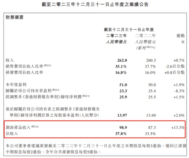 在2023年,中生制药全年营收262亿元,同比增长0.7%,经调整后归母净利润25.9亿元,同比增长1.5%。具体来看,创新产品是中生制药收入增长的重要动力。2023年,中生制药创新产品收入达到98.9亿元,同比增加13.3%;6个创新产品于年内获批,创新产品数量由2015年的2个,快速攀升至2023年末的11个;创新收入占总收入比例也从2015年的11%,迅速提升至2023年的38%。
