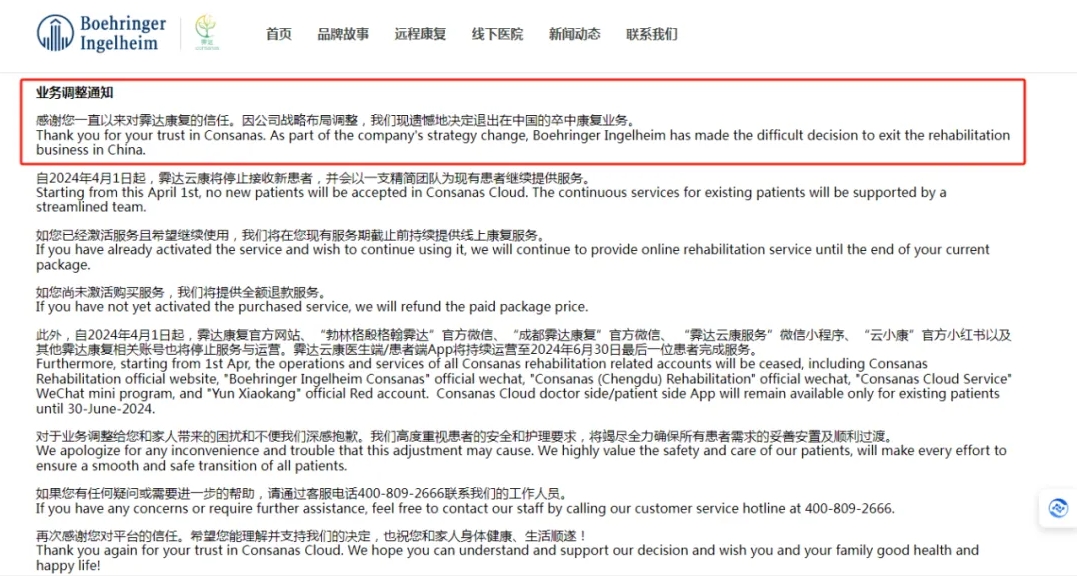 近期,勃林格殷格翰旗下卒中康复品牌“霁达康复”在官网宣布,因战略布局调整,退出在中国的卒中康复业务。自2024年4月1日起,霁达云康将停止接收新患者,并会以一支精简团队为现有患者继续提供服务。