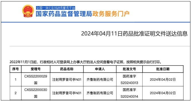 4 月 11 日,NMPA 官网显示,齐鲁制药的 3.4 类生物药注射用罗普司亭获批上市(受理号:CXSS2200029),推测适应症为原发免疫性血小板减少症。