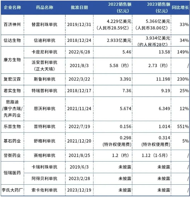 除了百济神州的PD-1外,君实生物和信达生物的PD-1产品销售额显著增长,分别实现了9.19亿元和28亿元的销售额。信达生物的PD-1信迪利单抗在2022年销售额下滑后,去年再次强势反弹,目前共有7个适应症获得了NMPA批准。