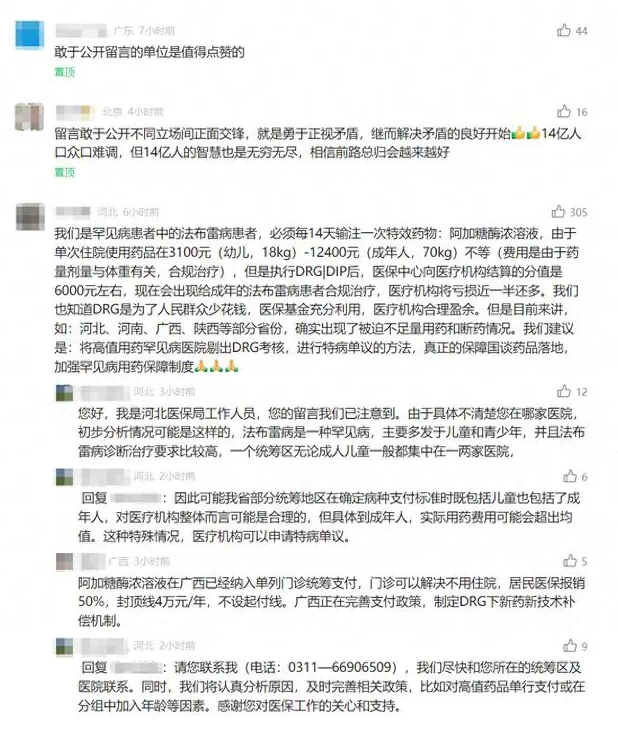 比如,一名自称法布雷病患者留言称,自己必须每14天输注一次特效药物——阿加糖酶浓溶液,单次住院使用该药在3100元-12400元不等(药量剂量与体重有关),但在执行DRG/DIP后,医保中心向医疗机构结算的分值是6000元左右,会出现给成年法布雷病患者合规治疗后医疗机构将亏损近一半多的情况。该网友在留言中建议将高值罕见病用药剔除DRG考核,进行特病单议的方法,加强罕见病用药保障。