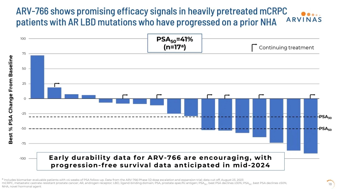 去年10月,Arvinas在欧洲肿瘤内科学会(ESMO)上公布ARV-766治疗转移性去势抵抗性前列腺癌(mCRPC)患者的1/2期临床试验的积极疗效、耐受性结果。ARV-766使41%带有任何LBD突变mCRPC患者的前列腺特异性抗原(PSA)水平降低≥50%(PSA50),并使50%携带AR L702H突变肿瘤mCRPC患者达成PSA50。此外,ARV-766亦展现良好的耐受性。此试验的无进展生存期(PFS)数据预计将在2024年公布。基于此数据,Arvinas将优先启动ARV-766治疗mCRPC的3期临床试验,并预定在2024年第二季度与监管单位进行相关讨论。