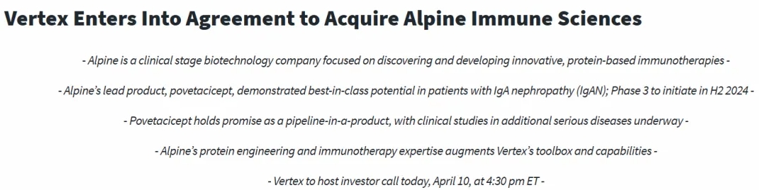 4月10日,Vertex Pharmaceuticals 和Alpine Immune Sciences共同宣布,两家公司已达成最终协议,根据协议,Vertex将以每股65美元或约49亿美元的现金收购Alpine。该交易获得了Vertex和Alpine董事会的一致批准,预计将于本季度晚些时候完成。